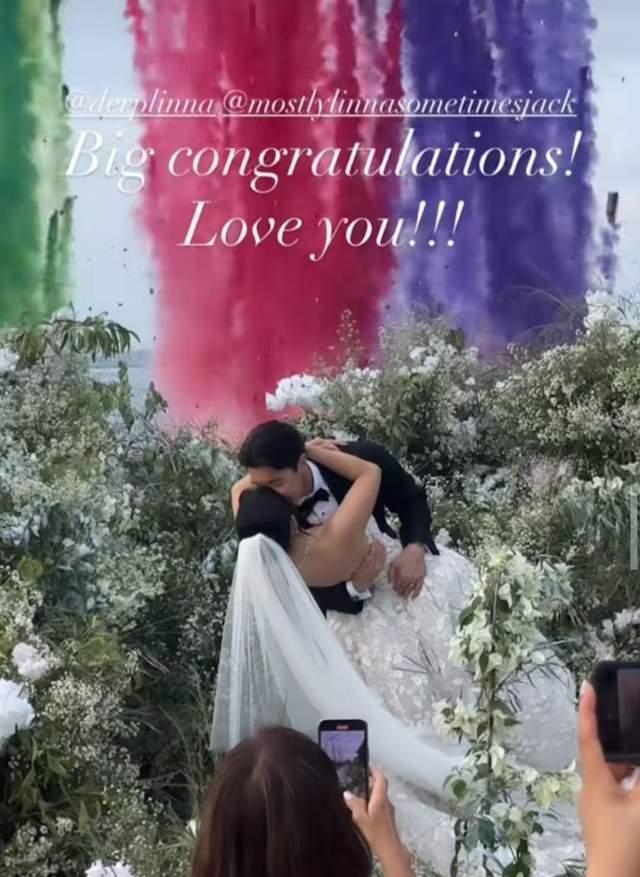 此外,林至昭还晒出了一段影片,影片中见到一对新人在布满鲜花的婚礼上甜蜜地拥吻,同时身后还出现了一大片彩色的烟花,画面可谓是非常唯美以及浪漫呀,在座的宾客们也都被这浪漫的氛围给包围着。